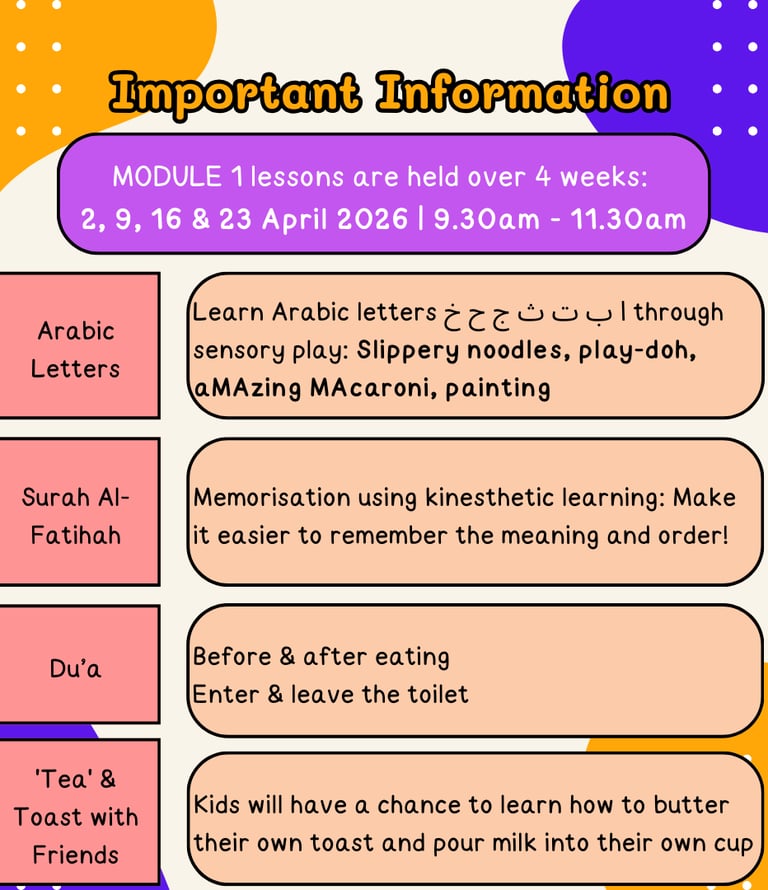 Activities include solat, homework supervision, outdoor play, art & craft and Islamic values education.